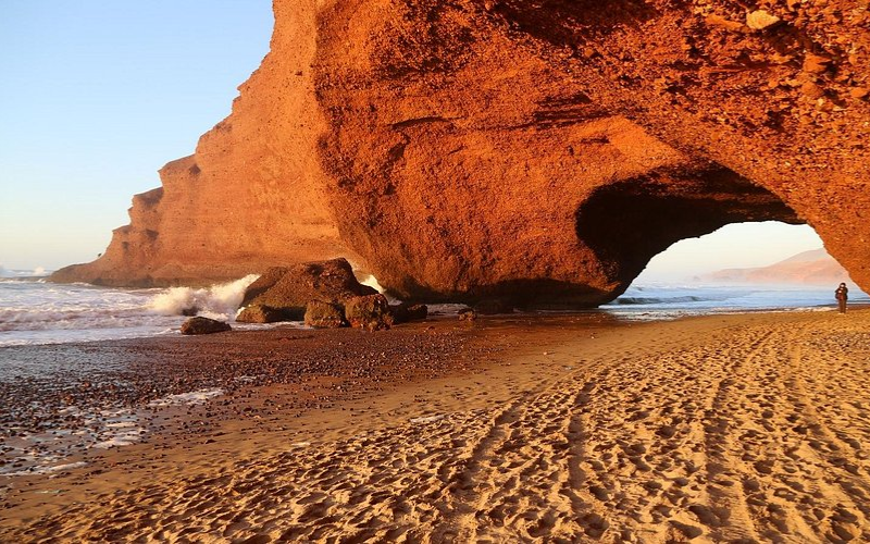 Legzira Beach is known for its red sea cliffs, and if you walk past the main arch, you will reach smaller natural arches carved by the tide and wind. These quiet sections have smooth sand, rock pools, and long open stretches that feel untouched. The beach sits near Sidi Ifni and is reachable by car or local taxi. Travelers visit for sunset views, strong waves, and wide open shorelines. The best time to walk toward the hidden arches is low tide, since high tide can block some paths. The area has a few cafés and small inns near the first arch. Photography lovers enjoy the color of the rock, which shifts as the sun moves. Bring water, sunscreen, and sandals that handle sand and rock. The beach is windy, so a light jacket helps, even in warm weather.